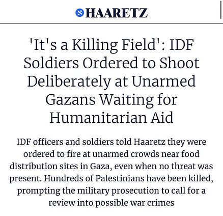 The Israeli press is publishing testimony from IDF soldiers that they received orders to gun down civilians in aid queues, even when there was no threat. And while we don't need the Israeli press to tell us this, it highlights the absurdity of calling people antisemites for discussing Israeli war crimes.
