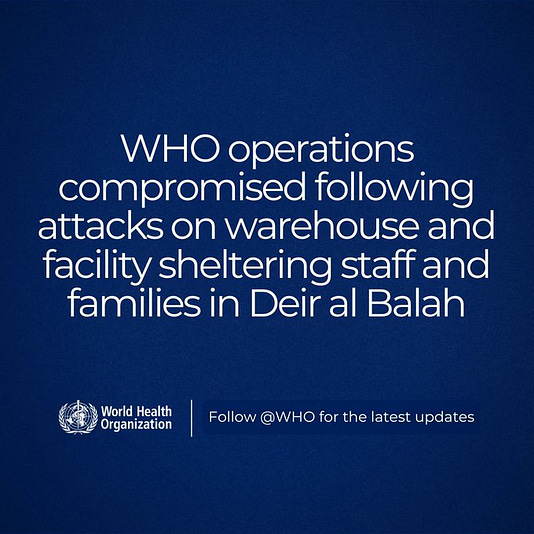 Instead of letting in the thousands of aid trucks at the border, Israel has decided the best course of action is to silence those who are in a position to report the facts, whether that be doctors, journalists, aid workers, or in this case, the World Health Organisation. If any other nation targeted the WHO there would be uproar, but it's Israel so we hear only murmurings of disapproval.