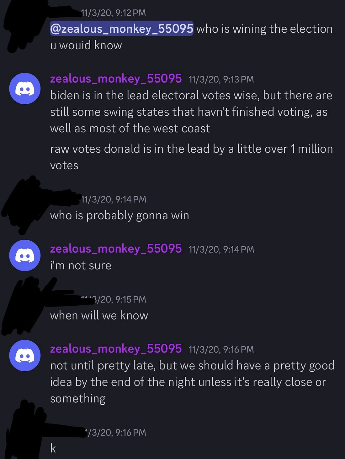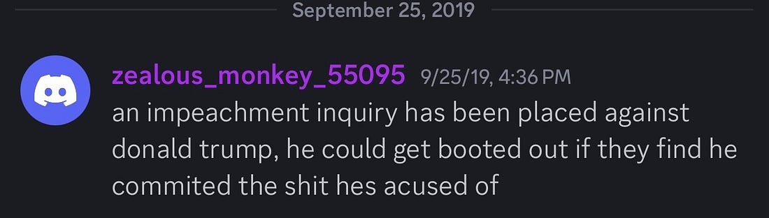 Private Discord messages shared with me by a friend of Robinson’s confirm that Robinson wasn’t some political martyr. A search for posts of Robinson’s containing keywords like “Biden” and “Trump” turned up just one hit each. The Trump post was a passing reference to the 2019 impeachment inquiry. The Biden one came on the day of the 2020 election, where he provided an update to another friend asking about the status of the vote count.