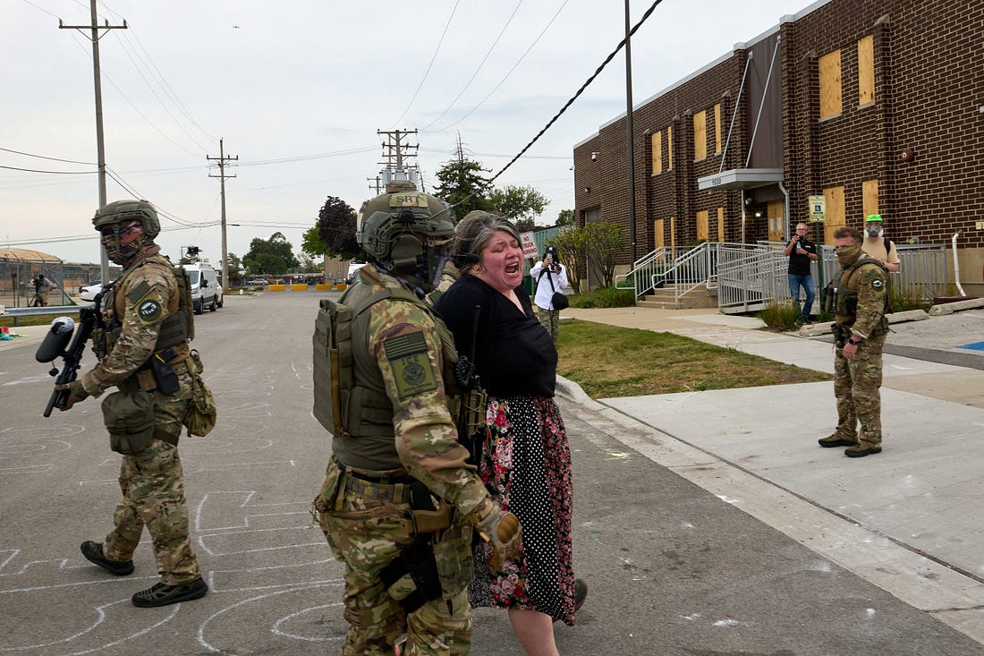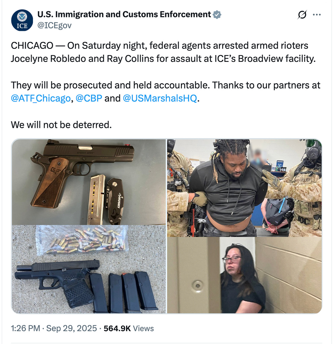 Don’t think there’s a real threat to American liberty here? In a nearly identical case the same month, two other people, Ray Collins and Jocelyn Robledo, an engaged couple from Chicago, were arrested while protesting outside the same ICE facility in Broadview, near Chicago.