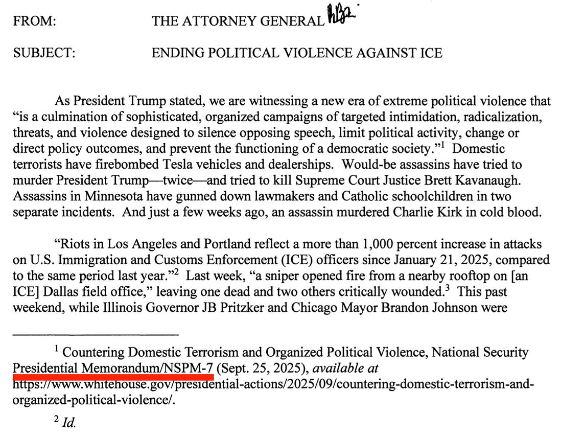 As Bondi’s directive goes on to quote from NSPM-7 specifically, targeting for arrest and prosecution “every person who aids, abets, or conspires” (whatever that means) with these anti-ICE forces of domestic terrorism.
