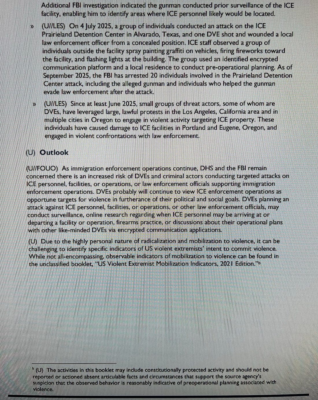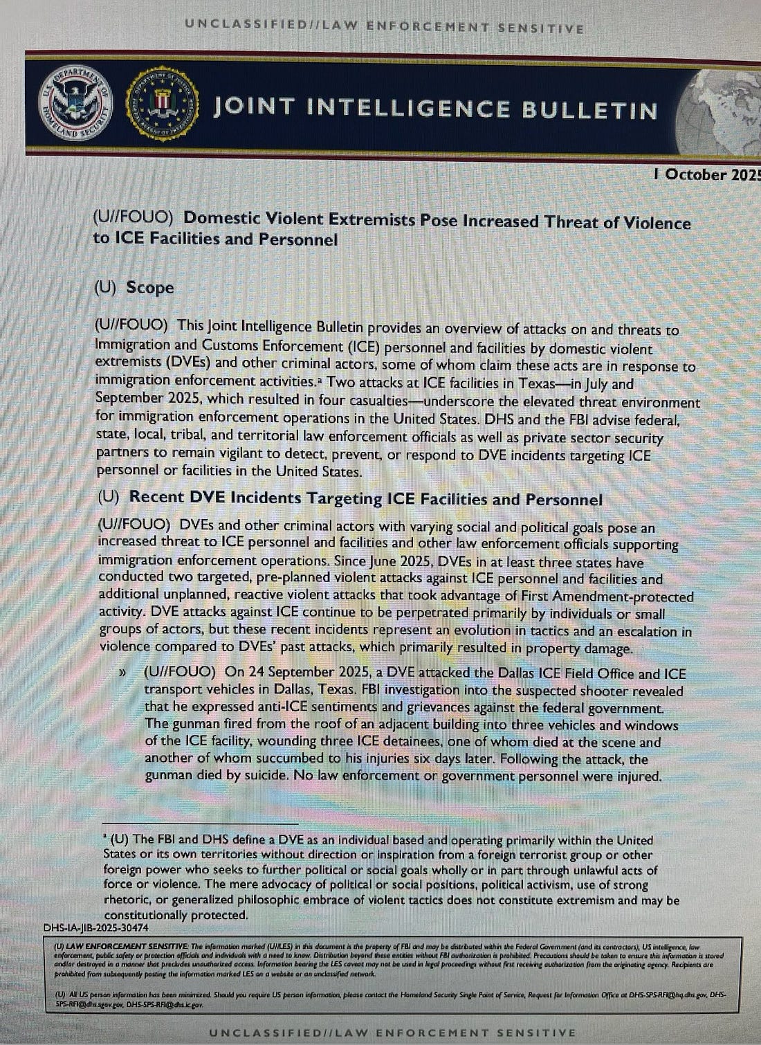 “Two attacks at ICE facilities in Texas — in July and September 2025, which resulted in four casualties — underscore the elevated threat environment for immigration enforcement operations in the United States,” the intelligence Bulletin says. “Since June 2025, DVEs in at least three states have conducted two targeted, pre-planned violent attacks against ICE personnel and facilities and additional unplanned, reactive violent attacks that took advantage of First Amendment-protected activity.”