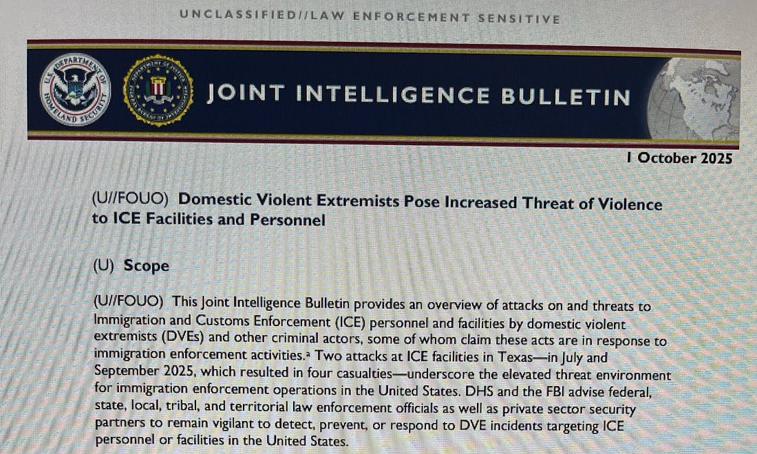 In late September, Attorney General Pam Bondi issued a directive citing Trump’s NSPM-7 throughout, titled “Ending Political Violence Against ICE.” Two days later, the Bulletin I obtained was produced.