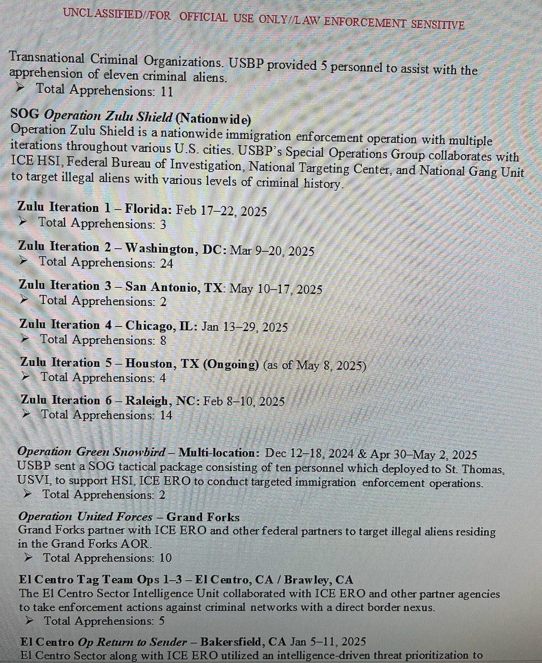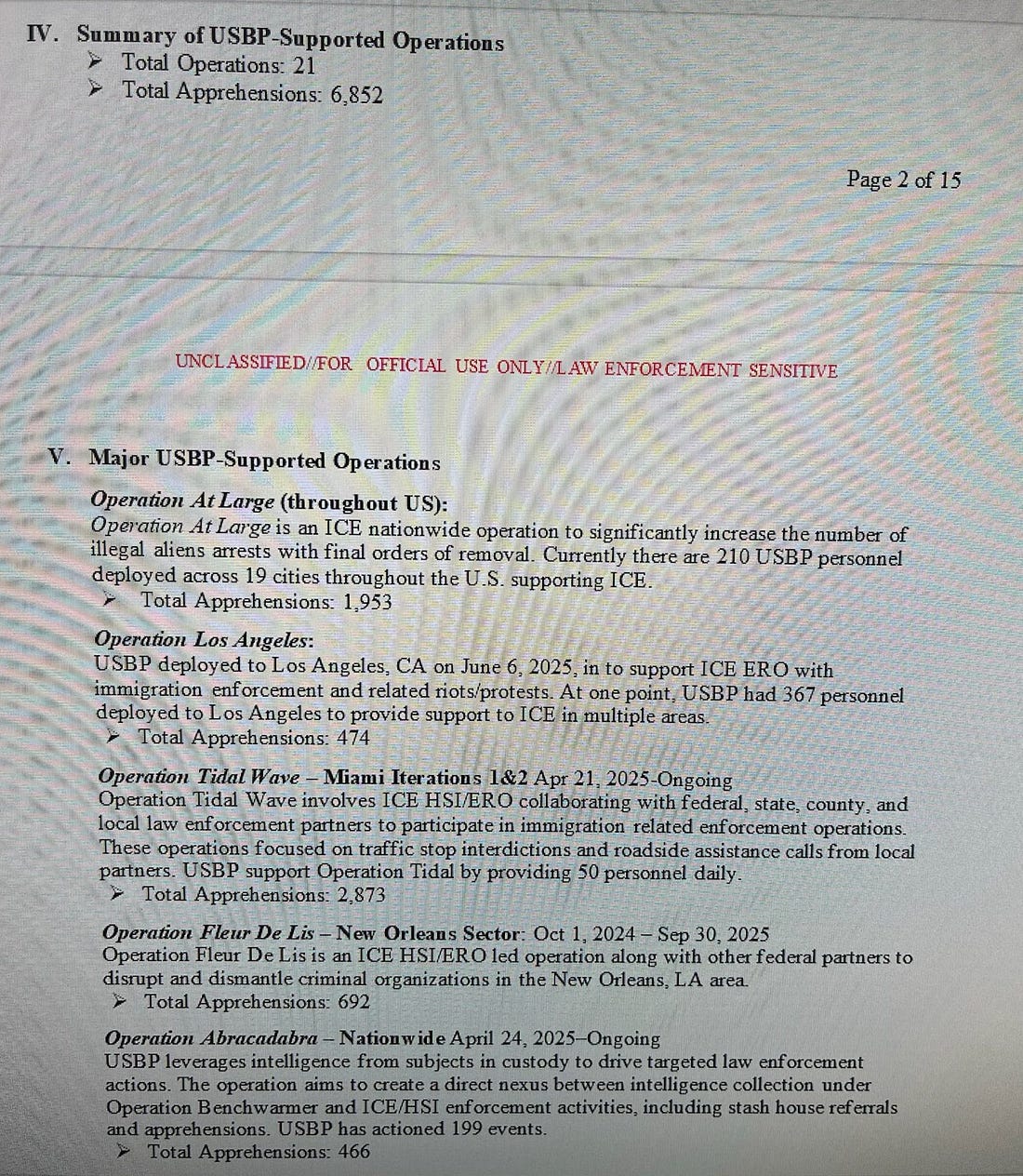A 15-page long document, marked “LAW ENFORCEMENT SENSITIVE,” details 21 different “major” ICE operations resulting, so it says, in 6,852 apprehensions since June. From Operation Abracadarba, a covert effort to develop informants among immigrants in detention, to Operation Benchwarmer, which alone spans the deployment of 2,000 “intelligence assets” across the country, the document gives a sense of how aggressively ICE is scouring neighborhoods and developing sources to spy on immigrants and Americans alike.