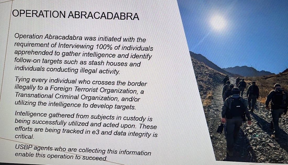 “Operation Abracadabra was initiated with the requirement of Interviewing 100% of individuals apprehended to gather intelligence and identify follow-on targets such as stash houses and individuals conducting illegal activity,” one of the documents, a briefing slide, reads. The purpose, it continues, is “Tying every individual who crosses the border illegally to a Foreign Terrorist Organization, a Transnational Criminal Organization, and/or utilizing the intelligence to develop targets.”