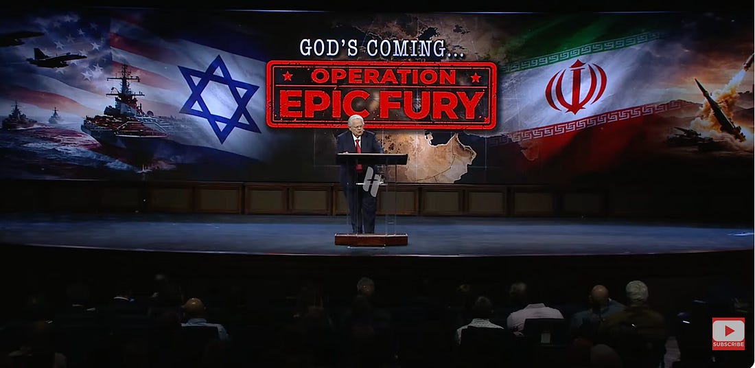 Televangelist John Hagee and chairman of Christians United for Israel delivered a sermon at the Cornerstone Church in San Antonio earlier this month, standing in front of a banner reading: “God’s coming…Operation ‘Epic Fury’.” In his sermon, he thanked Trump for having “crushed the enemies of Zion,” saying the attack on Iran will trigger biblically prophesied events including the invasion of Israel by a Russian-led army and Jesus’s defeat of the Antichrist at the Battle of Armageddon.