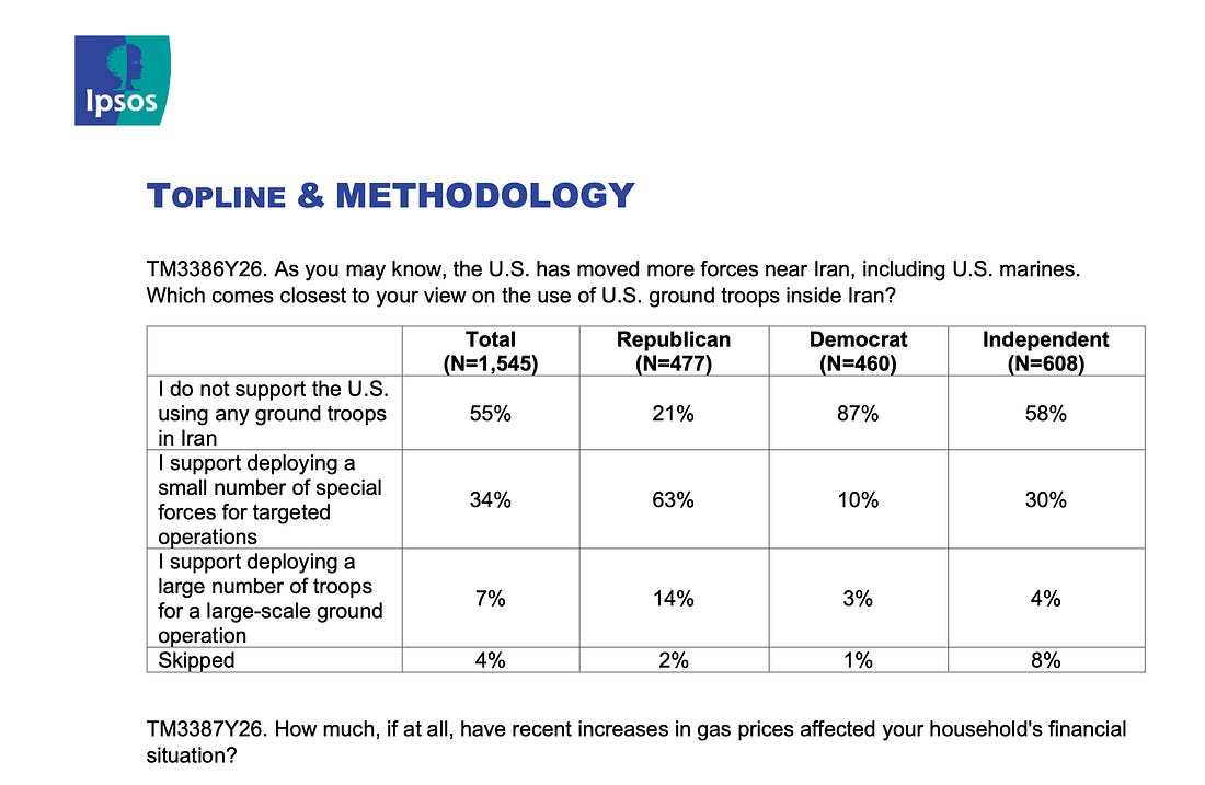 Tucked away in the Reuters poll is another question that no other pollster seems to be asking": whether Americans “support deploying a small number of special forces for targeted operations?”