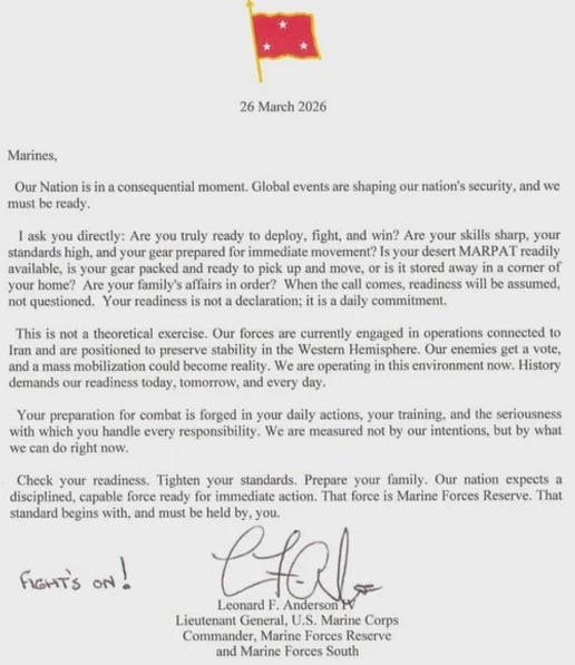Partly that is done through “messaging” and disinformation which encourages the media and even the experts to look in one direction, in this case, a “boots on the ground” invasion. The confusion is stoked by messaging like the letter (embedded below) written by Lt. Gen. Leonard F. Anderson IV, head of the Marine Corps Reserve, which blithely says that “a mass mobilization could become reality.”
