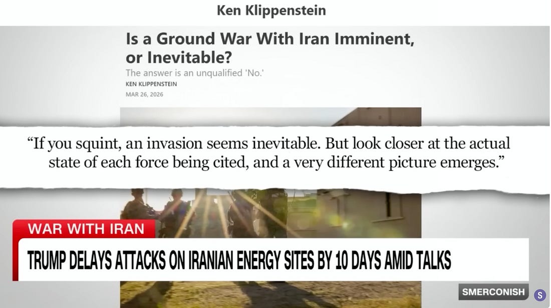 “I read something online from a guy who writes provocatively, admittedly, his name is Ken Klipperstein [sic],” Smerconish said, putting to his guest, retired Admiral James Stavridis, my point that a major ground invasion of Iran was simply not in the cards at this time.